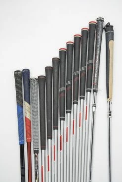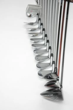 Set includes a Cobra King F7 9 degree Driver, a Cobra Speed LD F 5 Wood, a Cobra BioCell 4-5 Hybrid, Cobra King Forged Tec Irons 4-GW, a Cobra Big Trusty 55 degree wedge, and a Cobra Optica SI-01 33.5 in. Putter. Irons are in good condition with normal wear on the heads and faces, with KBS Tour shafts in R-flex and Golf Pride CP2 Pro grips.